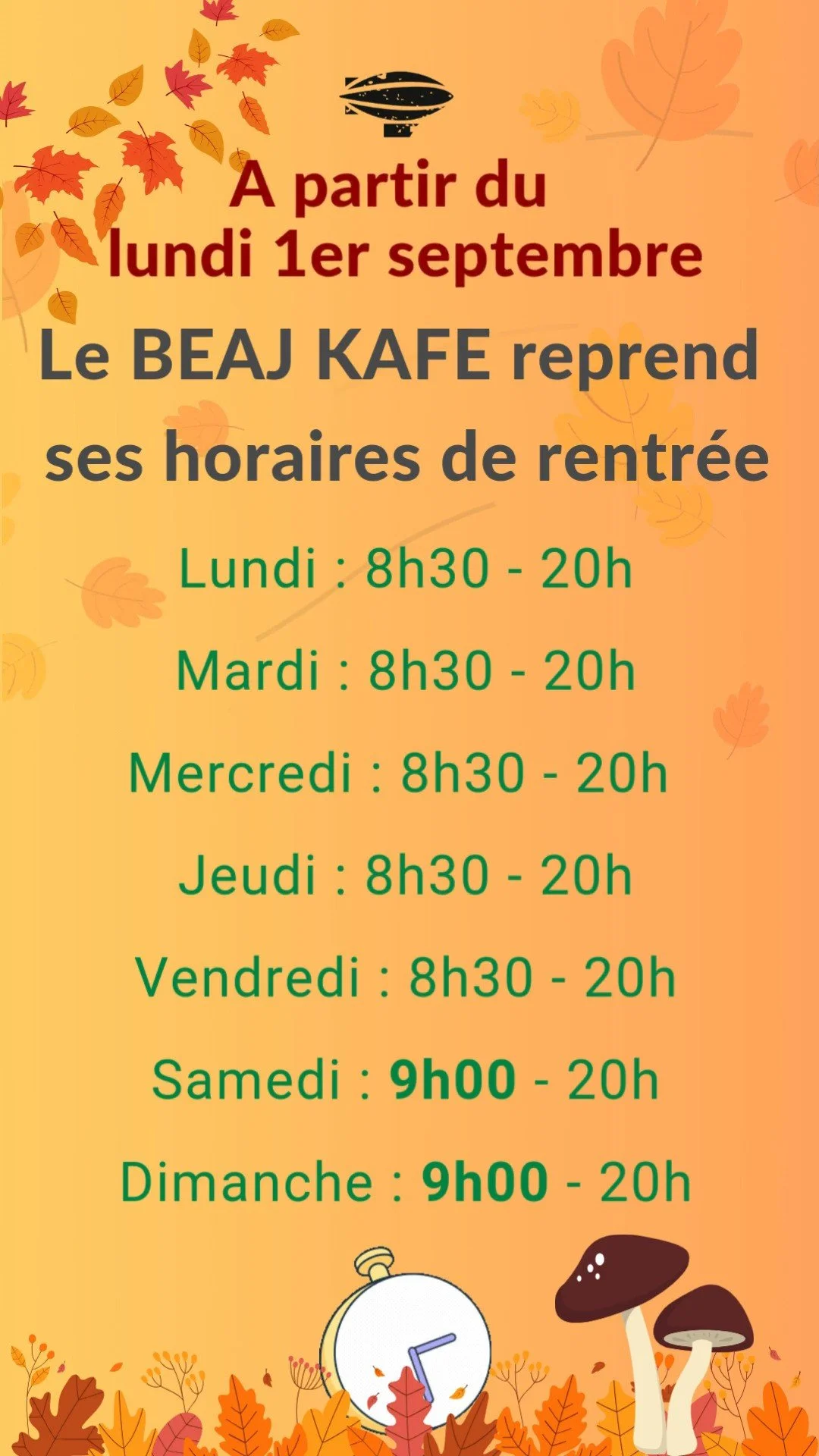 Créé en 2014 et situé au coeur de Brest, le BEAJ KAFE est un lieu d'accueil, de repos, de loisirs, de travail, de partage et de découvertes pour des personnes de tout âge et de tous horizons. Cet espace multi-usages évolue au fil des heures et des jours de la semaine et tente de s'adapter à l'état d'esprit de chacun et chacune.