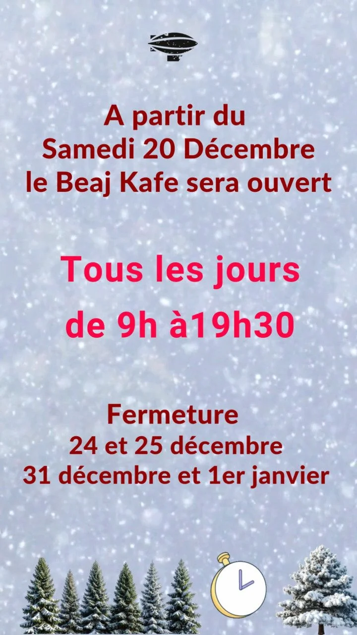 Venez assister toute l’année au différents événements accueillis par le Beaj Kafe. Atelier, exposition, concert, conférences… N’hésitez pas à consulter la programmation et à vous inscrire directement auprès des différents organisateurs.